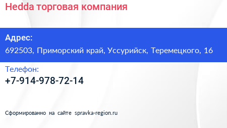 Hedda, торговая компания по адресу 692503, Приморский край, Уссурийск, Теремецкого, 16 в дальнейшем Организация, размещена в следующих категориях: