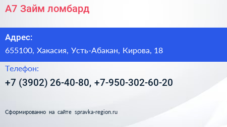 А7 Займ, ломбард по адресу 655100, Хакасия, Усть-Абакан, Кирова, 18 в дальнейшем Организация, размещена в следующих категориях: