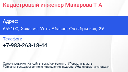 Кадастровый инженер Макарова Т.А. по адресу 655100, Хакасия, Усть-Абакан, Октябрьская, 29 в дальнейшем Организация, размещена в следующих категориях: