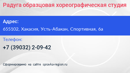 Радуга, образцовая хореографическая студия по адресу 655102, Хакасия, Усть-Абакан, Спортивная, 6а в дальнейшем Организация, размещена в следующих категориях:
