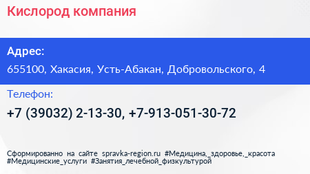Кислород, компания по адресу 655100, Хакасия, Усть-Абакан, Добровольского, 4 в дальнейшем Организация, размещена в следующих категориях: