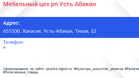 Мебельный цех, рп. Усть-Абакан по адресу 655100, Хакасия, Усть-Абакан, Тихая, 12 в дальнейшем Организация, размещена в следующих категориях: