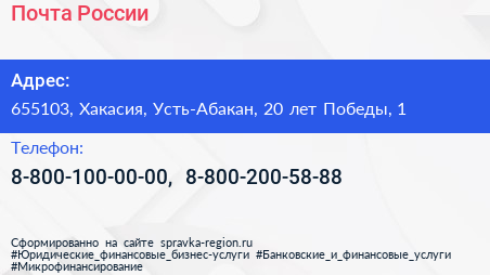 Почта России по адресу 655103, Хакасия, Усть-Абакан, 20 лет Победы, 1 в дальнейшем Организация, размещена в следующих категориях: