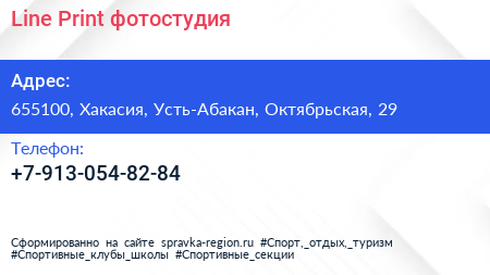 Line Print, фотостудия по адресу 655100, Хакасия, Усть-Абакан, Октябрьская, 29 в дальнейшем Организация, размещена в следующих категориях: