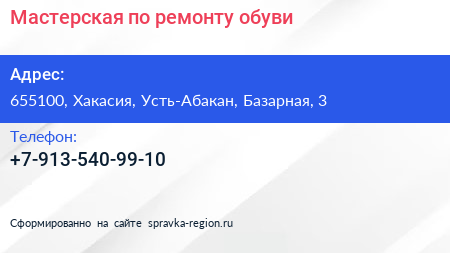 Мастерская по ремонту обуви по адресу 655100, Хакасия, Усть-Абакан, Базарная, 3 в дальнейшем Организация, размещена в следующих категориях:
