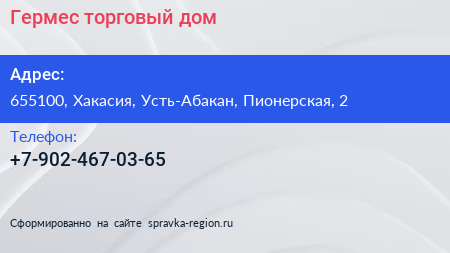 Гермес, торговый дом по адресу 655100, Хакасия, Усть-Абакан, Пионерская, 2 в дальнейшем Организация, размещена в следующих категориях: