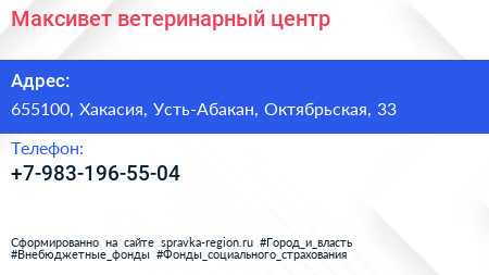 Максивет, ветеринарный центр по адресу 655100, Хакасия, Усть-Абакан, Октябрьская, 33 в дальнейшем Организация, размещена в следующих категориях: