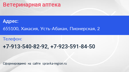 Ветеринарная аптека по адресу 655100, Хакасия, Усть-Абакан, Пионерская, 2 в дальнейшем Организация, размещена в следующих категориях:
