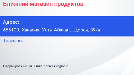 Ближний, магазин продуктов по адресу 655103, Хакасия, Усть-Абакан, Щорса, 39/а в дальнейшем Организация, размещена в следующих категориях:
