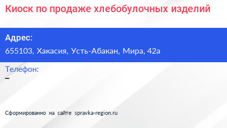 Киоск по продаже хлебобулочных изделий по адресу 655103, Хакасия, Усть-Абакан, Мира, 42а в дальнейшем Организация, размещена в следующих категориях: