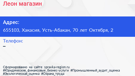 Леон, магазин по адресу 655103, Хакасия, Усть-Абакан, 70 лет Октября, 2 в дальнейшем Организация, размещена в следующих категориях:
