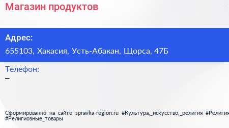 Магазин продуктов по адресу 655103, Хакасия, Усть-Абакан, Щорса, 47Б в дальнейшем Организация, размещена в следующих категориях:
