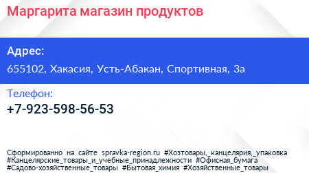 Маргарита, магазин продуктов по адресу 655102, Хакасия, Усть-Абакан, Спортивная, 3а в дальнейшем Организация, размещена в следующих категориях: