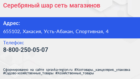 Серебряный шар, сеть магазинов по адресу 655102, Хакасия, Усть-Абакан, Спортивная, 4 в дальнейшем Организация, размещена в следующих категориях: