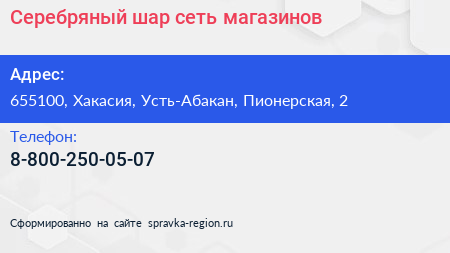 Серебряный шар, сеть магазинов по адресу 655100, Хакасия, Усть-Абакан, Пионерская, 2 в дальнейшем Организация, размещена в следующих категориях: