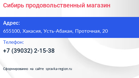 Сибирь, продовольственный магазин по адресу 655100, Хакасия, Усть-Абакан, Проточная, 20 в дальнейшем Организация, размещена в следующих категориях: