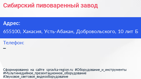 Сибирский пивоваренный завод по адресу 655100, Хакасия, Усть-Абакан, Добровольского, 10 лит Б в дальнейшем Организация, размещена в следующих категориях: