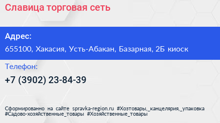 Славица, торговая сеть по адресу 655100, Хакасия, Усть-Абакан, Базарная, 2Б киоск в дальнейшем Организация, размещена в следующих категориях: