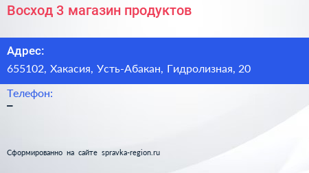 Восход-3, магазин продуктов по адресу 655102, Хакасия, Усть-Абакан, Гидролизная, 20 в дальнейшем Организация, размещена в следующих категориях: