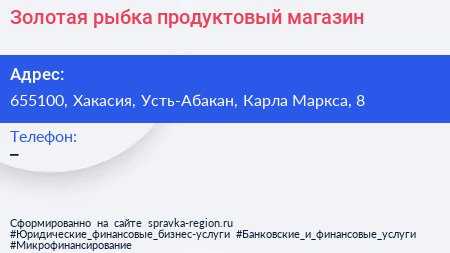 Золотая рыбка, продуктовый магазин по адресу 655100, Хакасия, Усть-Абакан, Карла Маркса, 8 в дальнейшем Организация, размещена в следующих категориях: