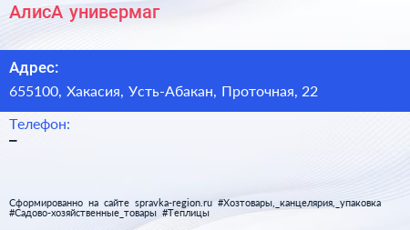 АлисА, универмаг по адресу 655100, Хакасия, Усть-Абакан, Проточная, 22 в дальнейшем Организация, размещена в следующих категориях: