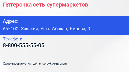Пятерочка, сеть супермаркетов по адресу 655100, Хакасия, Усть-Абакан, Кирова, 3 в дальнейшем Организация, размещена в следующих категориях: