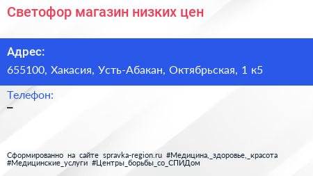 Светофор, магазин низких цен по адресу 655100, Хакасия, Усть-Абакан, Октябрьская, 1 к5 в дальнейшем Организация, размещена в следующих категориях: