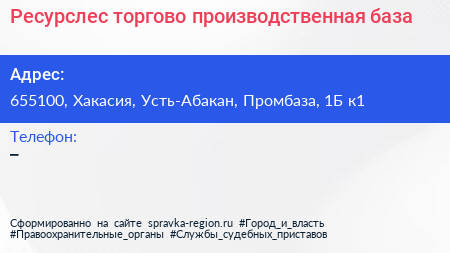 Ресурслес, торгово-производственная база по адресу 655100, Хакасия, Усть-Абакан, Промбаза, 1Б к1 в дальнейшем Организация, размещена в следующих категориях: