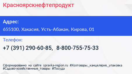 Красноярскнефтепродукт по адресу 655100, Хакасия, Усть-Абакан, Кирова, 01 в дальнейшем Организация, размещена в следующих категориях: