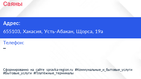 Саяны по адресу 655103, Хакасия, Усть-Абакан, Щорса, 19а в дальнейшем Организация, размещена в следующих категориях: