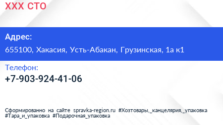 XXX, СТО по адресу 655100, Хакасия, Усть-Абакан, Грузинская, 1а к1 в дальнейшем Организация, размещена в следующих категориях: