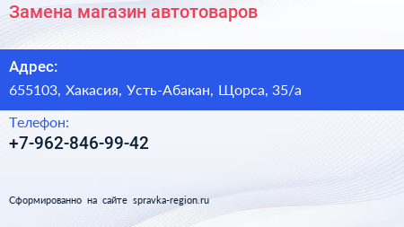 Замена, магазин автотоваров по адресу 655103, Хакасия, Усть-Абакан, Щорса, 35/а в дальнейшем Организация, размещена в следующих категориях: