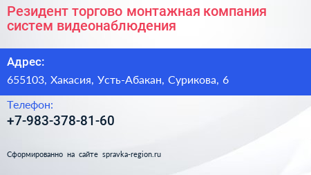 Резидент, торгово-монтажная компания систем видеонаблюдения по адресу 655103, Хакасия, Усть-Абакан, Сурикова, 6 в дальнейшем Организация, размещена в следующих категориях: