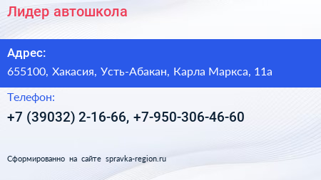 Лидер, автошкола по адресу 655100, Хакасия, Усть-Абакан, Карла Маркса, 11а в дальнейшем Организация, размещена в следующих категориях: