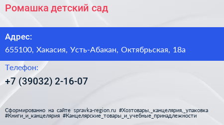 Ромашка, детский сад по адресу 655100, Хакасия, Усть-Абакан, Октябрьская, 18а в дальнейшем Организация, размещена в следующих категориях: