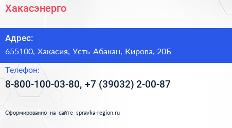 Хакасэнерго по адресу 655100, Хакасия, Усть-Абакан, Кирова, 20Б в дальнейшем Организация, размещена в следующих категориях: