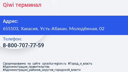 Qiwi, терминал по адресу 655103, Хакасия, Усть-Абакан, Молодёжная, 02 в дальнейшем Организация, размещена в следующих категориях: