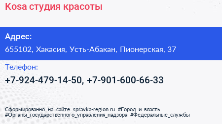 Kosa, студия красоты по адресу 655102, Хакасия, Усть-Абакан, Пионерская, 37 в дальнейшем Организация, размещена в следующих категориях: