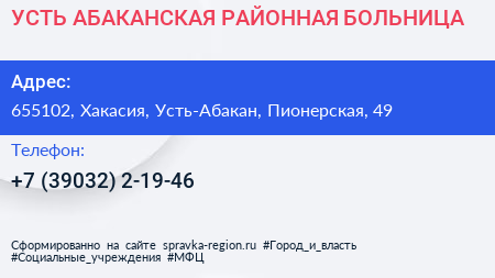 УСТЬ-АБАКАНСКАЯ РАЙОННАЯ БОЛЬНИЦА по адресу 655102, Хакасия, Усть-Абакан, Пионерская, 49 в дальнейшем Организация, размещена в следующих категориях: