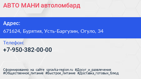 АВТО МАНИ, автоломбард по адресу 671624, Бурятия, Усть-Баргузин, Огуло, 34 в дальнейшем Организация, размещена в следующих категориях: