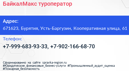БайкалМакс, туроператор по адресу 671623, Бурятия, Усть-Баргузин, Кооперативная улица, 61 в дальнейшем Организация, размещена в следующих категориях: