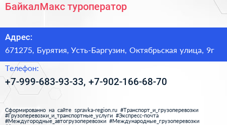 БайкалМакс, туроператор по адресу 671275, Бурятия, Усть-Баргузин, Октябрьская улица, 9г в дальнейшем Организация, размещена в следующих категориях: