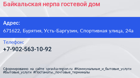 Байкальская нерпа, гостевой дом по адресу 671622, Бурятия, Усть-Баргузин, Спортивная улица, 24а в дальнейшем Организация, размещена в следующих категориях: