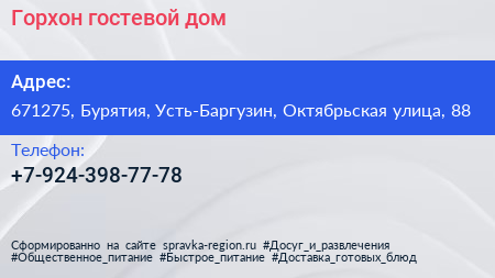 Горхон, гостевой дом по адресу 671275, Бурятия, Усть-Баргузин, Октябрьская улица, 88 в дальнейшем Организация, размещена в следующих категориях: