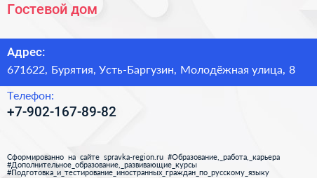 Гостевой дом по адресу 671622, Бурятия, Усть-Баргузин, Молодёжная улица, 8 в дальнейшем Организация, размещена в следующих категориях: