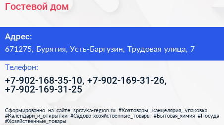 Гостевой дом по адресу 671275, Бурятия, Усть-Баргузин, Трудовая улица, 7 в дальнейшем Организация, размещена в следующих категориях: