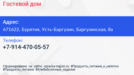 Гостевой дом по адресу 671622, Бурятия, Усть-Баргузин, Баргузинская, 8а в дальнейшем Организация, размещена в следующих категориях: