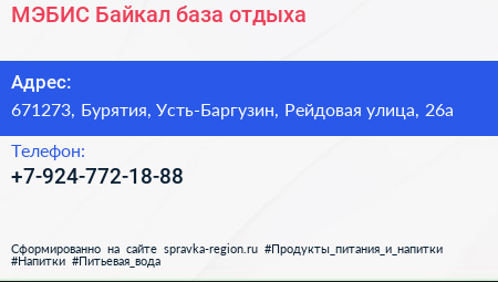 МЭБИС Байкал, база отдыха по адресу 671273, Бурятия, Усть-Баргузин, Рейдовая улица, 26а в дальнейшем Организация, размещена в следующих категориях: