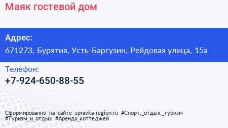 Маяк, гостевой дом по адресу 671273, Бурятия, Усть-Баргузин, Рейдовая улица, 15а в дальнейшем Организация, размещена в следующих категориях: