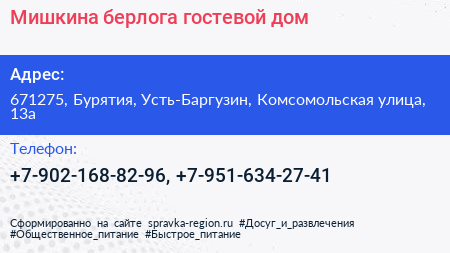 Мишкина берлога, гостевой дом по адресу 671275, Бурятия, Усть-Баргузин, Комсомольская улица, 13а в дальнейшем Организация, размещена в следующих категориях: